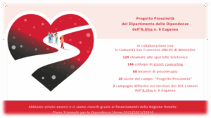 L’anno 2023 e parte del 2024, sono stati dedicati primariamente alle attività di supporto, presa in carico e counselling nei diversi territori dell’A. Ulss 6 Euganea. È emersa con forza quella parte invisibile, sommersa che ha iniziato a farsi sentire, a chiedere, talvolta anche con motivazioni di natura prettamente sociale (soldi/casa, risorse materiali, ecc.) che ha potuto attraverso le connessioni tra servizi, essere aiutata e compresa nel proprio malessere. Anche la richiesta di soluzioni immediate e certe volte, imposte, ha potuto trovare accoglienza e ascolto. Lo sforzo effettuato è stato quello di trasmettere sempre la possibilità di scegliere come affrontare il dispiacere e la complessità di vita che deriva dall’essere accanto ad una persona che diventa fruitore di sostanze e che se divenuto dipendente, deve poter accedere a servizi specialisti.
