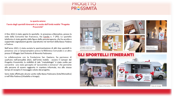 A fine 2022 è stato aperto lo sportello in presenza a Monselice, presso la sede della Comunità San Francesco, Via Candie n. 7 (PD). Lo sportello telefonico è stato gestito dalla figura dello psicoterapeuta, che ha accolto e supportato segnalazioni giunte soprattutto nei territori della Bassa Padana e Padova.