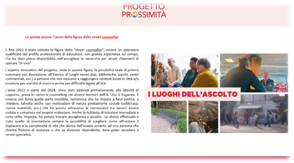 Il progetto ha saputo distinguersi per la qualificante disponibilità a modificare attività, prestazioni e luoghi allo scopo di costruire risposte ai tanti bisogni emersi di persone e famiglie che difficilmente si rivolgono ai servizi territoriali tradizionali per vergogna, stigma sociale.