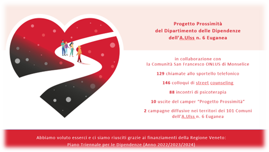 L’anno 2023 e parte del 2024, sono stati dedicati primariamente alle attività di supporto, presa in carico e counselling nei diversi territori dell’A. Ulss 6 Euganea. È emersa con forza quella parte invisibile, sommersa che ha iniziato a farsi sentire, a chiedere, talvolta anche con motivazioni di natura prettamente sociale (soldi/casa, risorse materiali, ecc.) che ha potuto attraverso le connessioni tra servizi, essere aiutata e compresa nel proprio malessere. Anche la richiesta di soluzioni immediate e certe volte, imposte, ha potuto trovare accoglienza e ascolto. Lo sforzo effettuato è stato quello di trasmettere sempre la possibilità di scegliere come affrontare il dispiacere e la complessità di vita che deriva dall’essere accanto ad una persona che diventa fruitore di sostanze e che se divenuto dipendente, deve poter accedere a servizi specialisti.